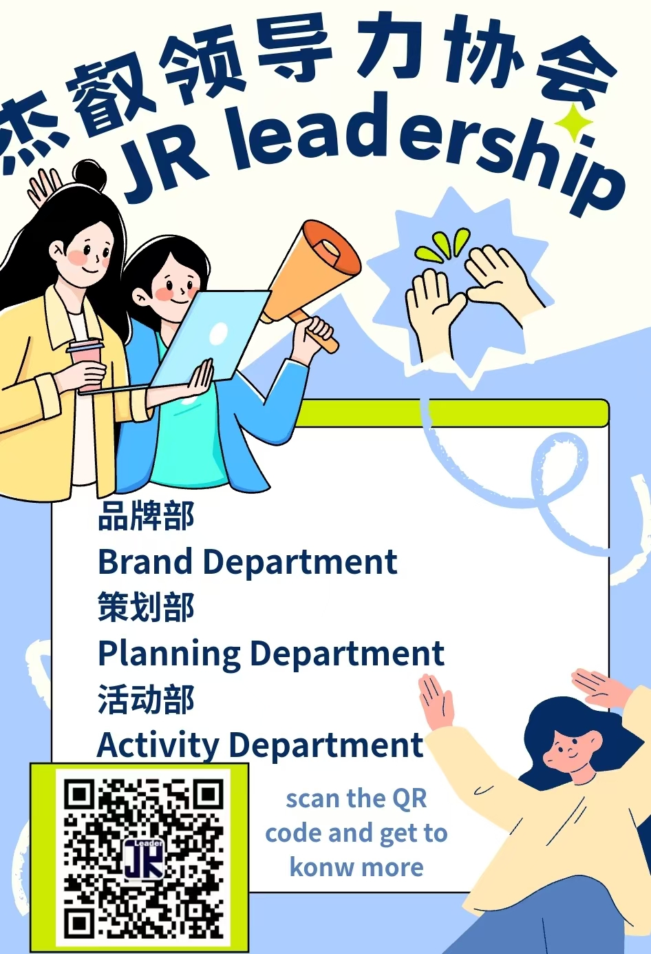 JR-leadership Association was founded in May, 2015, one of the official functional organization in XJTLU, and the only student organization focusing on leadership among youth. JR-leadership deems Positive and Impact as its core value, which prompts each and every member of JR to make improvement through positive attitude towards difficulties and make impact on others with actual practices. JR-leadership won the most progressive organization in the very first year after the establishment by providing XJTLU campus with professional leadership learning and communication platform. Weekly leadership theory lectures, along with after-class practice and group work, students are able to foster the cognization of leadership. JR-leadership has built stable partnership with numerous corporates settling in Suzhou and Shanghai which offers pro-training coach to XJTLU students, following by series tracking tools and exercise techniques to ensure the learning outcome. Meanwhile, support from university is driving JR to draw bigger pictures. Although JR is still a young organization, its determination and enthusiasm are leading to a promising future and all the JRer are dedicating to make it come true.
