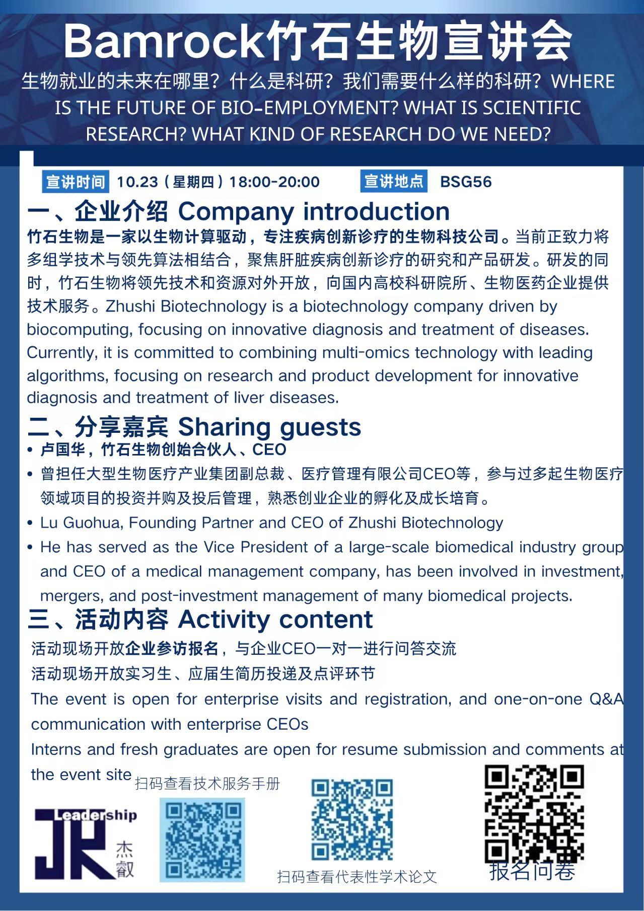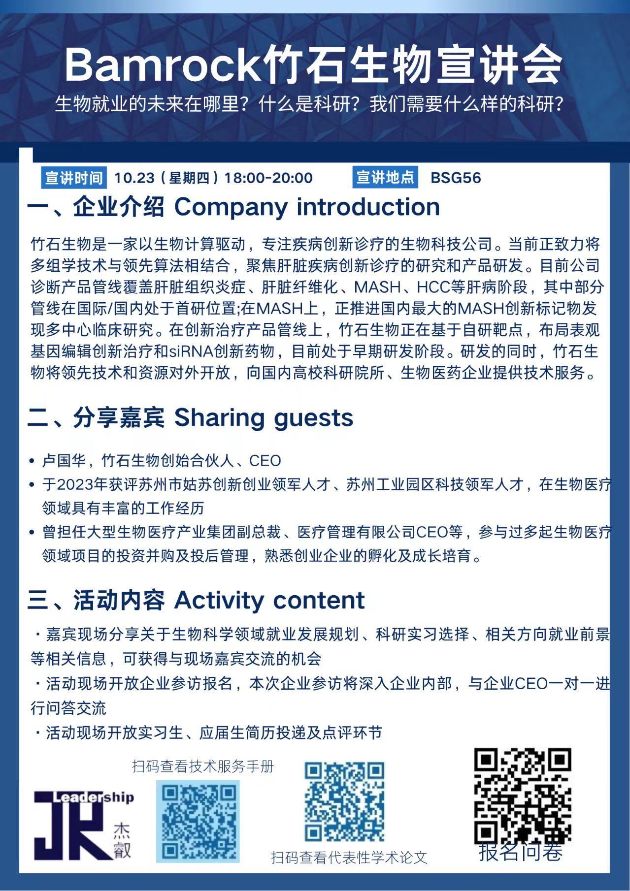 Bamrock guests share on-site information about career development plans in the field of biological sciences, choices for research internships, employment prospects in related fi