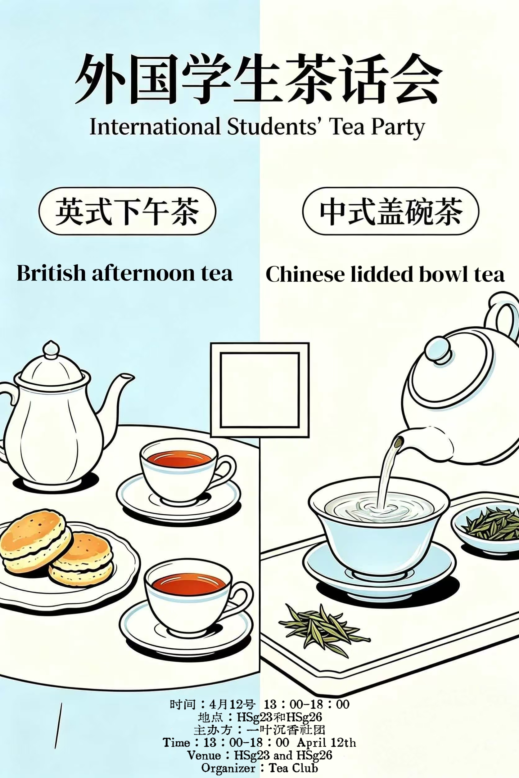This foreign students tea party has two classrooms: Classroom 1 for traditional Chinese tea culture experience and Classroom 2 for English afternoon tea, inviting you to enjoy the