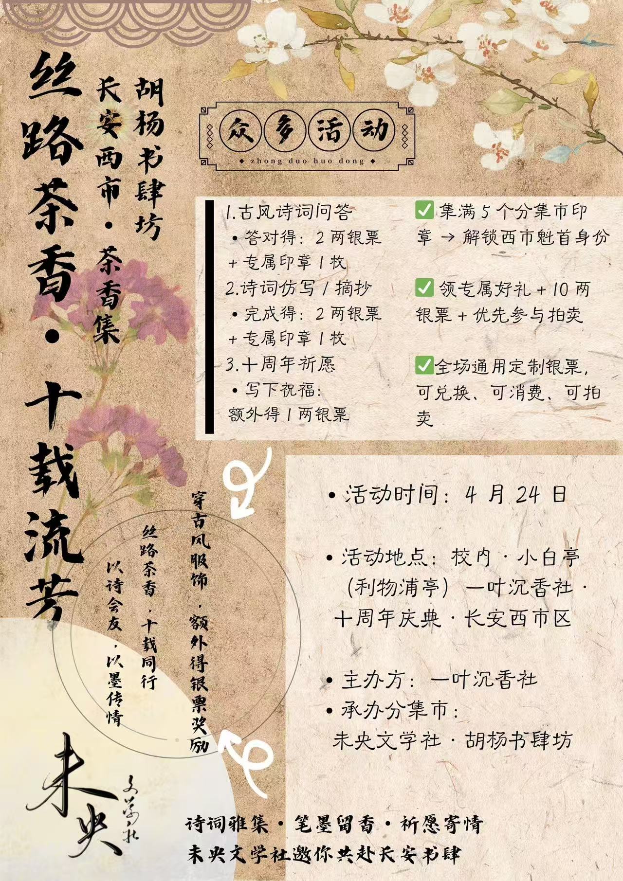 以文学为核心,融合古风诗词、文字互动、祈愿寄语的特色分集市,为活动 参与者打造沉浸式的文学体验场景,同时完成集章、银票发放任务,助力主活动身份进阶 玩法,彰显未央文学社的文学氛围与社团特色。